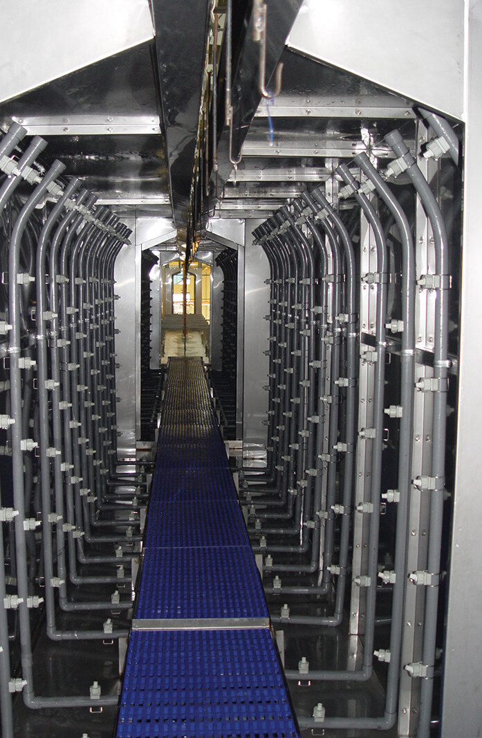 通過前處理生產線可以對工件表麵(miàn)的氧化皮、鐵鏽、油脂、塵土等汙垢物進行徹底清洗,使塗裝粉體(tǐ)與金屬表麵結合牢固、附(fù)著(zhe)力強,從而使產品(pǐn)獲得高品質,延長產品的使用壽命。